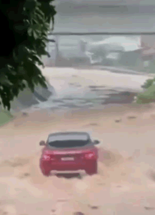 Imagens gravadas mostram o veículo sendo levado pela água e desaparecendo em poucos segundos, até cair num rio.